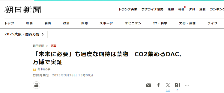 藤川茂紀教授(カーボンニュートラル・エネルギー国際研究所(WPI-I²CNER:アイスナー)副所長/ネガティブエミッションテクノロジー研究センター センター長)が研究代表を務めるNEDOムーンショット型研究開発事業で開発を進めている、Direct Air Capture and Utilization(DAC-U)装置の実証試験と展示を2025年日本国際博覧会(大阪・関西万博)で行います。この記事は4月1日の朝日新聞に掲載されました。